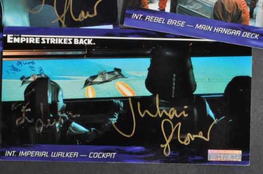 Star Wars - The Empire Strikes Back - Ian Liston (1948-2016 Wes Janson / AT-AT Driver) and Julian Glover (General Veers). Collection of x3 autographed Topps Widevision trading cards. One signed by Liston in black ink, one signed by Glover in gold ink and a dual signed card by both in gold ink (Liston a little faint). Obtained personally by the vendor.