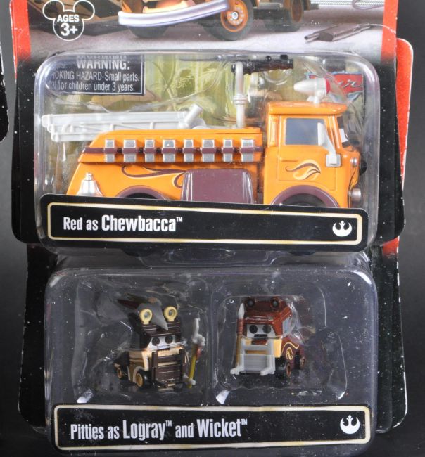 Star Wars - Disney Parks ' Cars ' - a collection of scarce original Disney Parks exclusive Cars related diecast models. All contents appearing mint, and all remain sealed and unopened. Includes; Lightning McQueen As Jedi Luke Skywalker, Chick Hicks as Boba Fett, Red as Chewbacca, Sarge as Emperor Palpatine, Pitties As Logray. All as new.