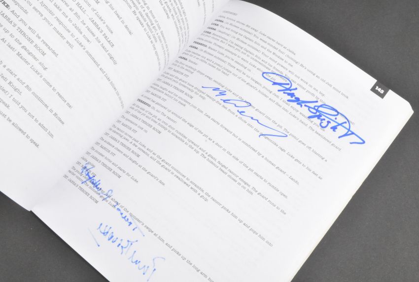 Star Wars - The Scripts - an important ' Star Wars - The Scripts ' original trilogy script book signed by approx x200 of the original cast and crew. A lifetime's work for the vendor, the book represents one of the best single-item collection of Star Wars autographs in existence. Mixture of dedicated and undedicated, some signed with quotes. Autographs include; Mark Hamill, Carrie Fisher, Anthony Daniels, Kenny Baker, Ian McDiarmid, Gary Kurtz, Dave Prowse, Peter Mayhew, Billy Dee Williams, James Earl Jones, Jeremy Bulloch, Garrick Hagon, Mike Edmonds, Michael Carter, Michael Sheard, Gilbert Taylor, Rusty Goffe, Peter Taylor, Bruce Boa, Nick Maley, Wendy Leech, Dave Holland, Phil Brown, Brian Muir, Bob Anderson, Richard LaParmentier, Shane Rimmer, Tim Rose, Paul Blake, Katie Purvis, Ken Colley, Ian Liston, John Altman, Derek Chafer, John Hollis, Anthony Forrest, Mike Houston, Ronnie Taylor, Jamie Harcourt, Syd Wragg, Eileen Roberts, Jack Klaff, Denis Lawson, Michael Culver, Alan Harris, Chris Parsons, Julian Glover, Alan Tomkins, Richard Bonehill, Stephanie English, Terence Mustoo, Michael Ford, Quentin Pierre, Ian Durrant, Jack McKenzie, John Ratzenberger, John Morton, Colin Skeaping, Doug Robinson, Roger Nichols, Denis Lowe, Catherine Munroe, Bill Hargreaves, Robert Watts, Toby Philpott, Mike Quinn, Dermot Crowley, Caroline Blakiston, Philip Herbert, Warwick Davis, Gerald Home, Simon J Williams, Paul Brooke, Trevor Butterfield, Paul Weston, Vic Armstrong, Ken Coombs, Wendy Allen, and many others. Signed to the inner front cover, title pages for each movie and various pages within - usually by an actor / crew members lines / work. A unique and impressive piece of Star Wars memorabilia.