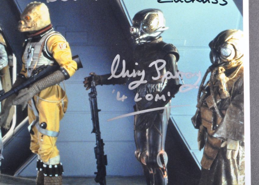 Star Wars - The Empire Strikes Back - Bounty Hunters - Jeremy Bulloch (1945-2020 Boba Fett), Alan Harris (1938-2020 Bossk), Catherine Munroe (Zuckuss) and Chris Parsons (4-LOM) - a multi-signed Official Pix 8x10" colour photograph from the movie, signed by all four actors. Signed in gold, silver and black ink respectively. All with character names added. Unique item. All obtained in person by the vendor from various Star Wars events.