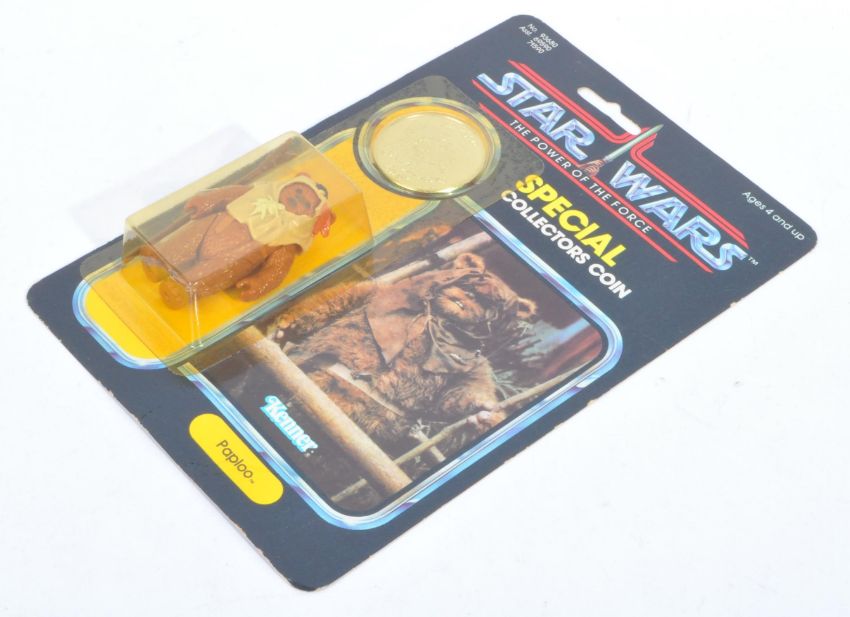 Star Wars - An original vintage 1984 Kenner made Star Wars ' The Power Of The Force ' series carded MOC Last 17 action figure ' Paploo '. Factory sealed upon its original 92 back POTF card, with Special Collectors Coin. The bubble fully factory sealed with no splits or dents and weapon still taped in place. Card back near mint, with minor veining in places. Made In Mexico issue. Generally near mint example.