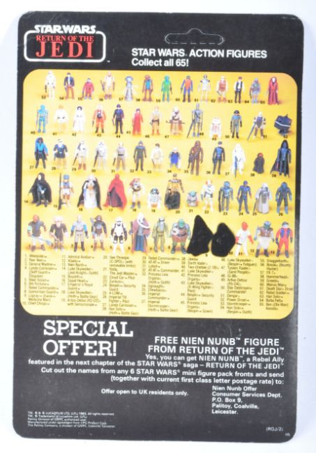 Star Wars - An original vintage 1983 Palitoy made Star Wars carded MOC action figure ' Klaatu '. Factory sealed upon its original unpunched 65 back Return Of The Jedi card with Nien Nunb Figure offer to rear. The bubble with no splits or dents, weapon still taped in place. Card back very near mint, with some light veining to the top corner. Generally mint.