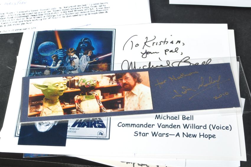Star Wars - a large collection of autographs on paper, letters, and some photographs from cast / crew associated with the franchise. Autographs include; Frank Henson, Lydia Green, Vic Armstrong, Nick Read (Ewok), Digby B. Milner (SFX), John Sylla (Ewok), DAvid Ankrum, Michael Bell, Cy Town, Malcolm Tierney, Barrie Holland, Drewe Henley, Raymond Griffiths, Peter Sumner, Chris Sanders, Pernilla August, Mark Jones, Nick Malay, Terence Stamp, Derek Lyons, Harry Fielder, and others. All obtained personally by the vendor.