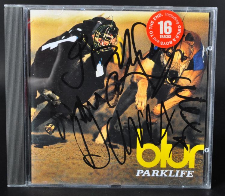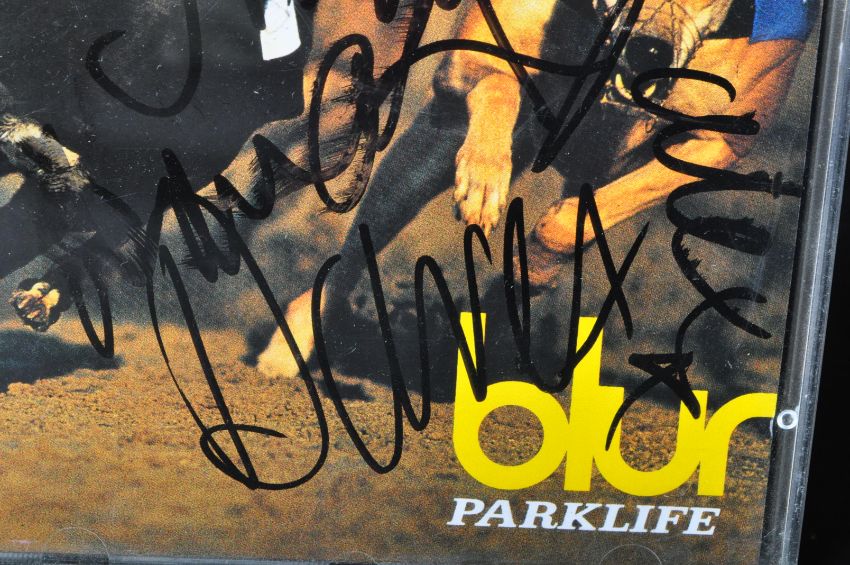 Blur - A whole band signed CD copy of Blur's Parklife. Signed by Damon Albarn, Graham Coxon, Alex James & Dave Rowntree in marker to the inner front cover paper sleeve.