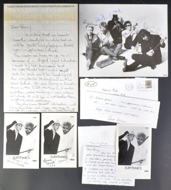 Eurythmics - Annie Lennox / Dave Stewart - 1980s British Pop Duo - a unique collection of letters and autographs between Lennox and Stewart to a fan in Bristol c1983. Includes a lengthy handwritten letter on 'The Tourists' notepaper (the band before Eurythmics) from Stewart which expresses unhappiness at having to leave the country for a few months 'because of a stupid legal situation caused by fat businessmen,' a scarce autographed 8x10" colour photograph of The Tourists - signed by all band members including Lennox, Stewart, Jim Toomey, Eddie Chin, and Peet Coombes, a 6x4" early Eurythmics promo card signed by Stewart and Lennox, same signed and dedicated just by Lennox, and two handwritten letters by Lennox sent to the fan, answering her questions, both postmarked for 1983. Unique items from the early days of the band.