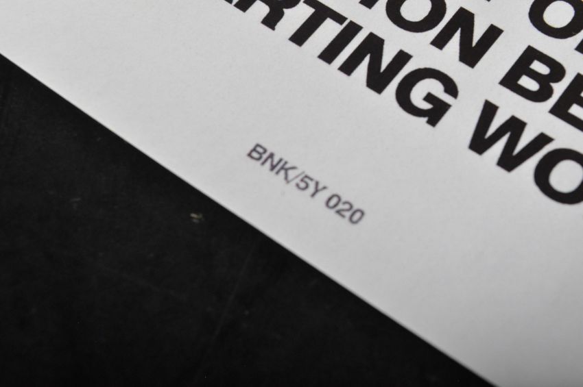 Banksy (British 1974-), ' Graffiti Artists Must Report To Reception Before Starting Work ', BNK/5Y 020. Starliner backed paste-up sticker in the form of a traditional warning sign with a yellow triangle motif. Obtained at the Oxfam Shop opposite the 'Banksy Vs Bristol Museum' Exhibition circa 2009. 10.5x15cm
