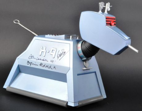Doctor Who - John Leeson (Voice),Bob Baker (creator) & Sophie Aldred (Ace) - a large 1/4 scale model of K9 from Dr Who. Autographed to the side by Leeson, Baker and Aldred. All neatly signed in black ink, Leeson adding the character name and catchphrase. Signed to the removable side panel. Autographs obtained personally by the vendor. Fantastic display piece. Approx 14" long.