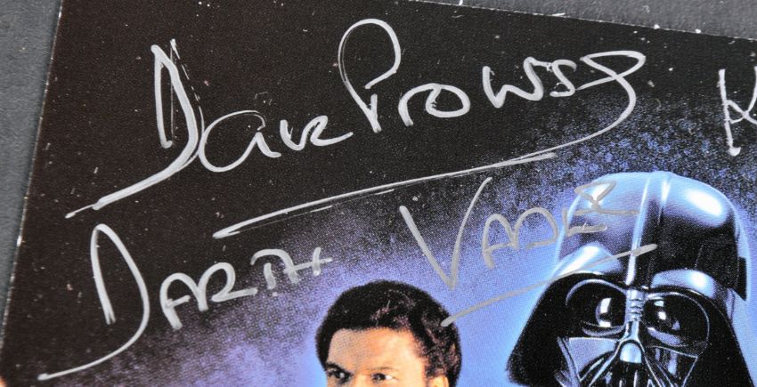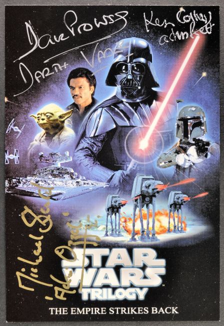Star Wars - Triple Signed Postcard - Dave Prowse (1935-2020), Ken Colley and Michael Sheard - triple-signed 6x4" Empire Strikes Back promotional postcard. Each signed in silver / gold ink, with character names added. All undedicated, and each obtained in person by the vendor from various public appearances.