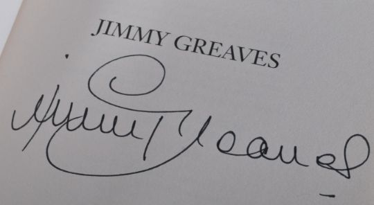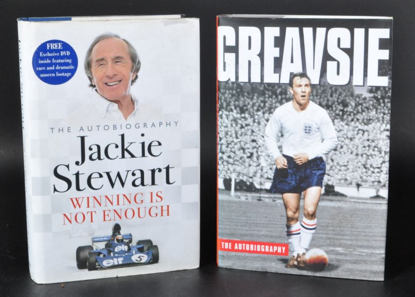 Sport - x2 autographed books - Jimmy Greaves (1940-2021 - English Footballer) ' Greavsie ' and Jackie Stewart (Formula One Racing Driver) ' Winning Is Not Enough '. Both hardcover books, with dust jackets. Signed to the title pages in black ink, undedicated. Both obtained personally by the vendor at booksignings in either Bristol or London.