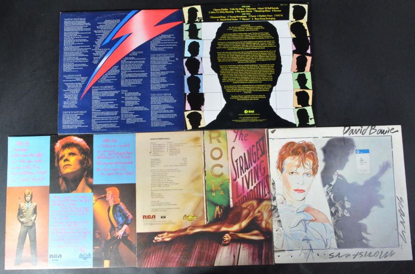 David Bowie - A collection of five long play LP vinyl record albums to include Bowie Pinups (Orange RCA, RS1003, VG+ condition), Diamond Dogs (Orange RCA label, APLI-0576, VG+ condition), Scary Monsters (Black RCA label, BOW LP2, VG+ condition, with insert), The Best Of Bowie (K-tel, NE1111, VG+ condition) and "Aladdin Sane" (Orange RCA. RS1001, VG+ condition, no sleeve).
