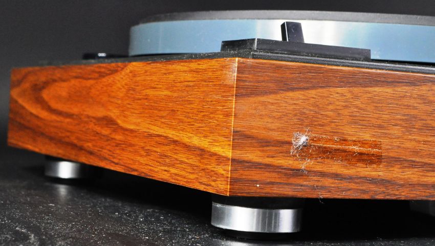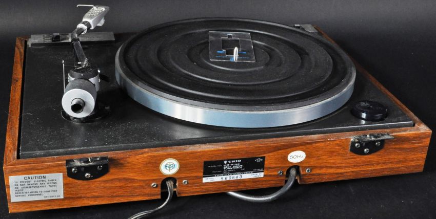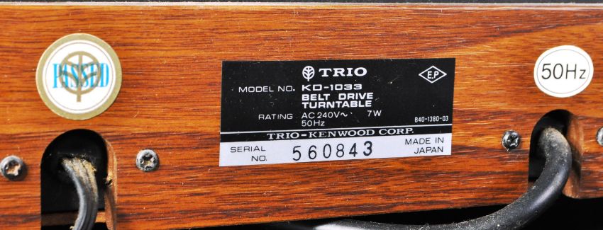 Trio - KD-1033 - Hi-Fi - A teak cased record player having a two speed belt driven turntable deck with weighted anti skating arm. No cover. Sold as untested by ourselves. Measures approx; 12cm x 46cm x 35cm.
