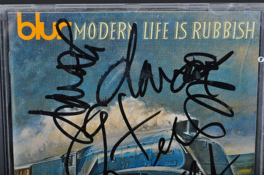 Blur - A whole band signed CD copy of Blurs' Modern Life Is Rubbish. Signed by Damon Albarn, Graham Coxon, Alex James & Dave Rowntree in marker to the inner front cover paper sleeve.