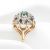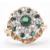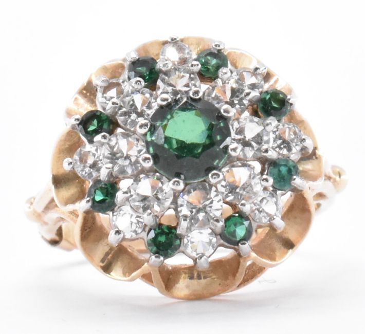 A hallmarked 9ct gold white and green stone cluster ring. The ring having a round head set with a cluster of stones with a pierced mount and plain band. Hallmarked Birmingham 1973. Size L.5. with resizer attached to the band. Weight 4.2g. Head measures 1.5cm.