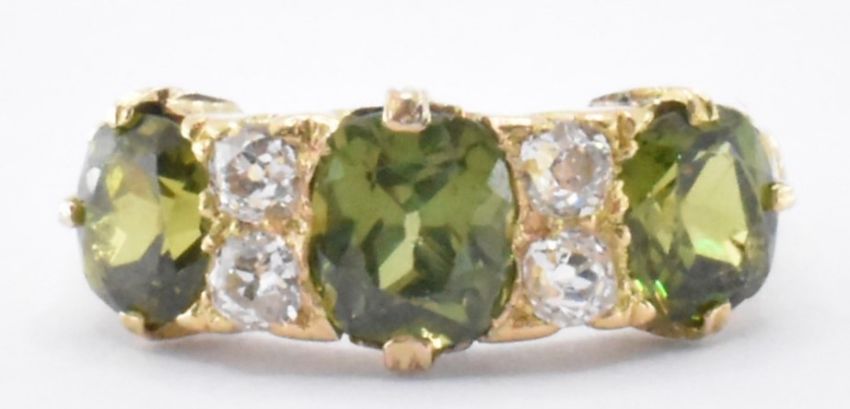 An 18ct gold demantoid garnet and diamond ring. The ring being set with three mixed cut green demantoid garnets set alternately with four round old cut diamonds. marked 18ct to the band. Principle garnet measures 7 x 6 x 4.3mm, secondary garnets measure 6.3 x 5.4 x 3.5mm. Weight 5.1g. Size R.5. With lab report for the garnets. Diamonds estimated 0.5ct.