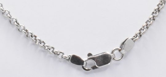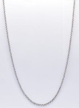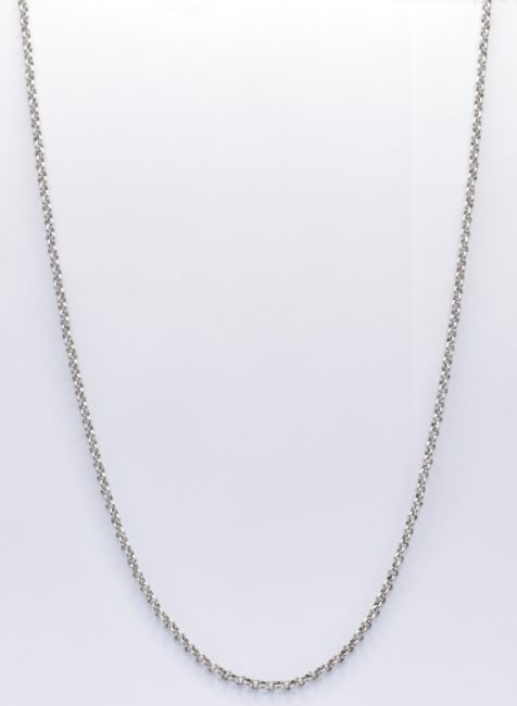 An 18ct white gold fine belcher link necklace chain having a lobster clasp. Clasp marked 750, tests indicate 18ct gold. Measures 50cm. Weight 13.5g.