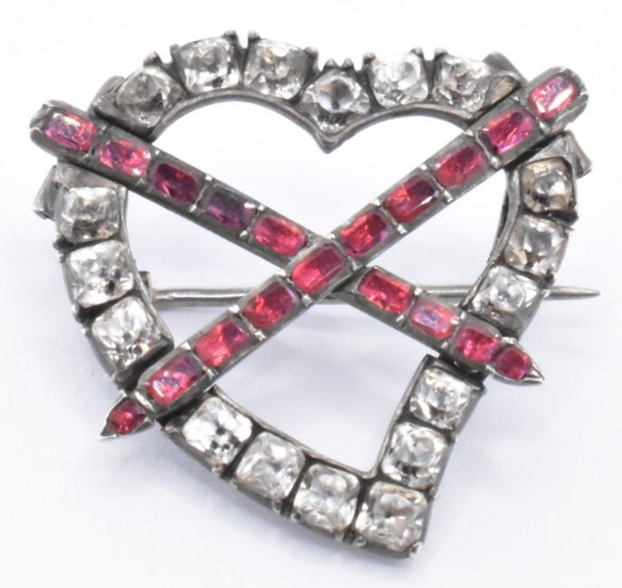 An 18th Century George III white metal and paste witch's heart brooch. The brooch being set with round cut paste stones with a red paste stones set in a cross to the front of the heart. Hinge pin with c clasp to the verso. Measures 2.8cm. Unmarked.