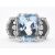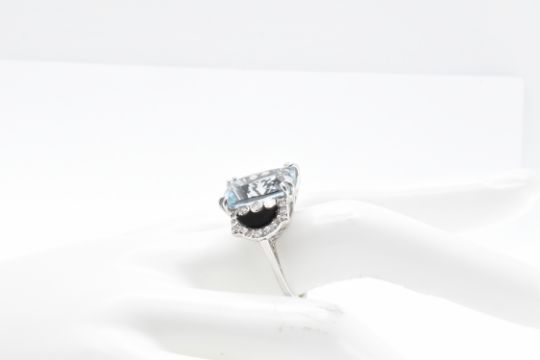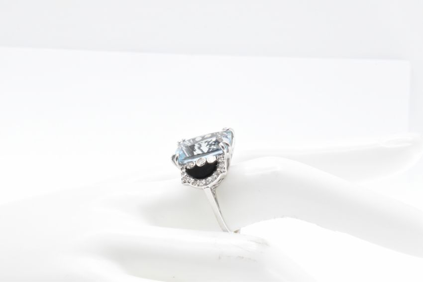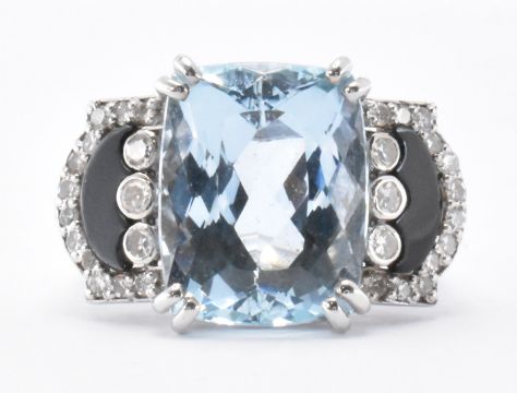 A white gold aquamarine, black onyx and diamond cocktail ring. The ring set with a cushion cut aquamarine, flanked by two black onyx panels and round cut diamonds. Aquamarine measures 1.54 x 1.22 0 .84cm. Unmarked. Weight 8.8g. Size Q.5.