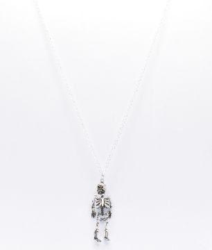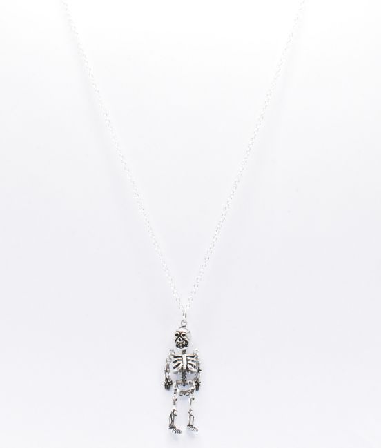 A silver pendant necklace having a fine link chain with a skeleton pendant. The skeleton having articulated limbs. Chain and pendant marked 925. Weight 6.6g. Chain measures 18 inches.