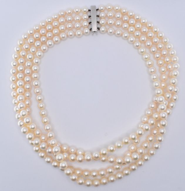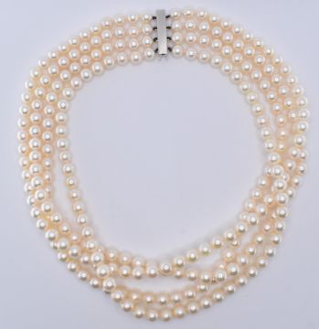 A four strand cultured pearl necklace being strung with cream round pearls with a pink overtone. The strands mounted to an 18ct white gold clasp. Shortest strand measures 14 inches. Pearls measure approx 6.5mm diameter.