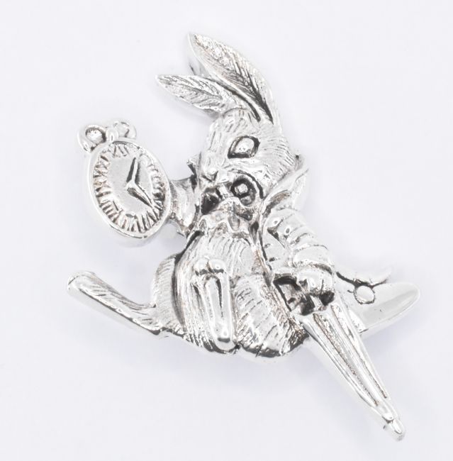 A silver brooch in the form of the White Rabbit from Alice in Wonderland. The brooch having a hinge pin verso, with a roll over clasp. Marked sterling. Measures 4.2cm. Weight 8.2g.