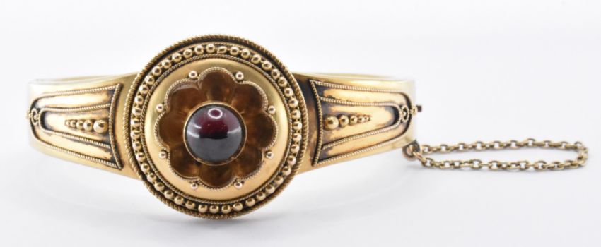 A 19th Century Victorian 15ct gold and garnet bangle bracelet. The bracelet having a round garnet cabochon set to a central round panel with rope twist and ball detailing with further embellishment to the shoulders. Hinged opening with a tongue in groove clasp and safety chain. Unmarked but tests indicate 15ct gold +. Weight 15.3g. Garnet measures 8mm diameter. In fitted box.