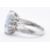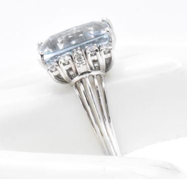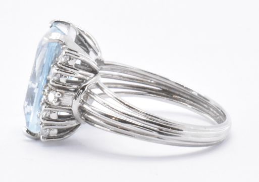 An 18ct white gold aquamarine and diamond cocktail ring. The ring being set with a cushion cut aquamarine flanked by twelve round cut diamonds. Aquamarine measures 1.33 x 1.02 x 0.61cm. Diamonds measures 2.3mm. Weight 6.1g. Size Q.5. Unmarked, tests indicate 18ct gold.