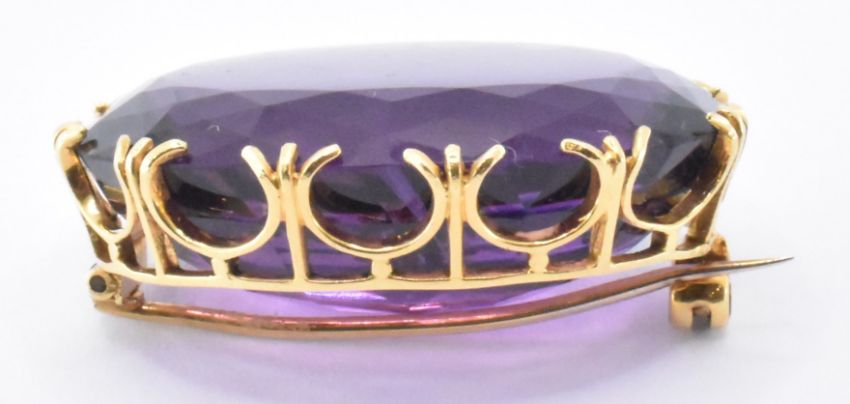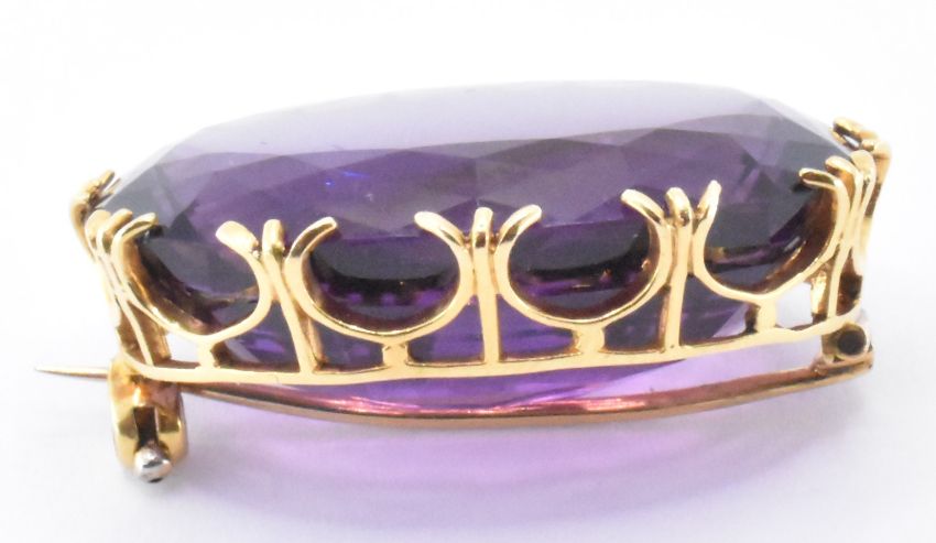 A 19th Century Victorian gold and amethyst brooch. The brooch being set with an oval cut amethyst in a gold mount. Tests to the mount indicate 18ct gold, tests to the pin indicate 9ct gold. Amethyst measures 3.3 x 2.4 x 1.3cm. Weight 17.1g.