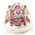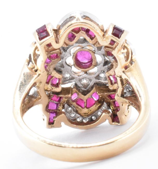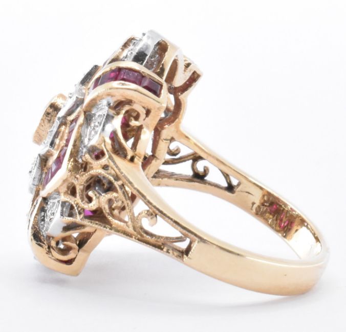 A 14ct gold ruby and diamond dress ring. The ring having a central oval cut ruby with further rectangular cut rubies and round cut diamonds in a floral mount. Marked 14k to the band, tests indicate 14ct gold. Weight 7.4g. Size O.