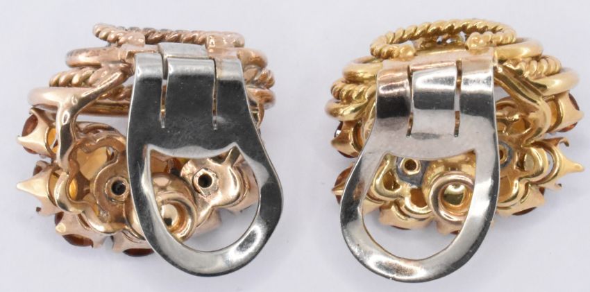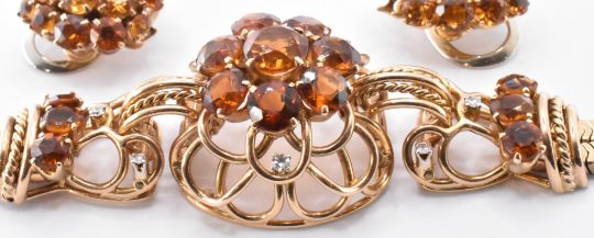 A hallmarked 1950's 9ct gold citrine and diamond bracelet and earrings demi parure jewellery suite. The bracelet having a central cluster of eight round cut citrines within a pierced mount, with further citrines and diamonds set to the shoulders, on a flat snake chain with clasp. Hallmarked London 1953 to the bracelet clasp, earrings test as 9ct gold. Bracelet measures 7 inches, earrings measure 2cm wide. Central citrine measures 7.5mm. One citrine missing to one earring, one diamond missing to bracelet, otherwise good condition. Weight 45.1g.