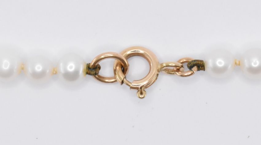A cultured pearl strung necklace with off round white cultured pearls with a pink overtone having a 9ct gold spring ring clasp. Measures 20 inches. Pearls measures between 4 and 5 mm diameter.