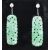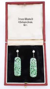 A pair of white gold, jade and diamond drop earrings. The earrings having stud fastenings set with single round brilliant cut diamonds to the head with a carved jade panel suspended from chains below. Diamonds measure 4mm diameter. Jade panels measure 3.5cm. Earrings measure 5.3cm. Tests to the posts indicate 9ct gold, backs marked 18ct. Weight 8.3g.