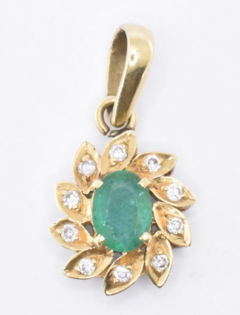 An 18ct gold emerald and diamond pendant. The pendant set with a central oval cut emerald with a halo of round cut diamonds within a floral design. Emerald measures 7 x 5.1 x 2.7mm. Unmarked tests indicate 18ct gold. Weight 3.1g. Measures 2.4cm including bale.