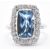 A white gold aquamarine and diamond cocktail ring. The ring being set with a rectangular cut aquamarine with a halo of round cut diamonds on a plain shank. Aquamarine measures 1.27 x 0.79 x 0.55cm. Diamonds measure 2.5mm. Unmarked, tests indicate 18ct gold. Weight 6.3g. Size P.5.