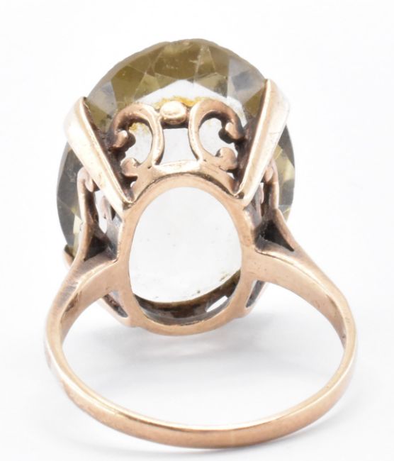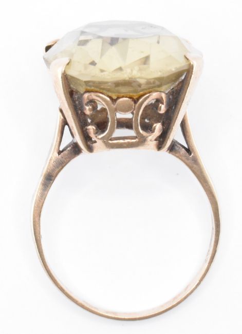 A hallmarked 9ct gold and citrine ring being set with an oval cut citrine in a scrolled mount. Citrine measures 2.4 x 1.7 x 0.94cm. Hallmarked London 1963. Weight 8.9g. Size S.5.
