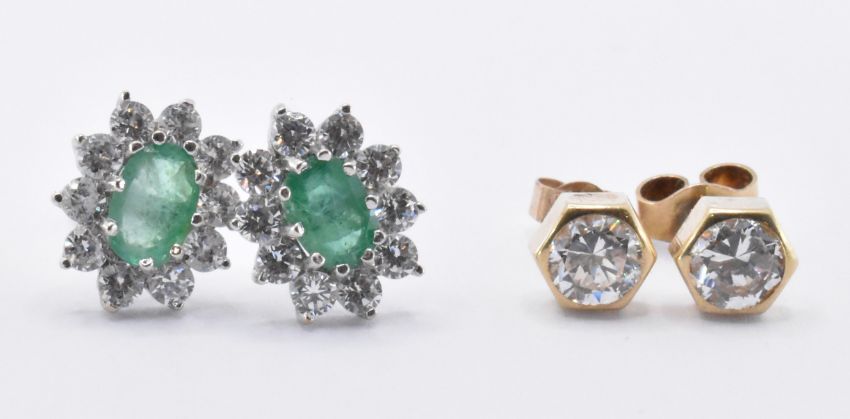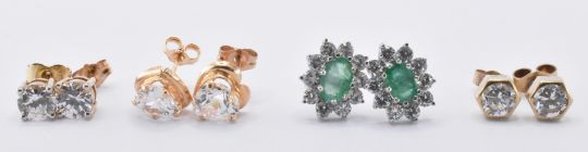 A group of four pairs of 9ct gold earrings to include a pair of emerald and white stone stud earrings, a pair of heart shaped white stone stud earrings, a pair of stud earrings set with round cut white stones, a pair of with hexagonal heads set with round cut white stones. All marked 375, apart from emerald earrings which test as 9ct gold to the posts. Emeralds measure 6.5 x 4.5mm. Total weight 5.0g.
