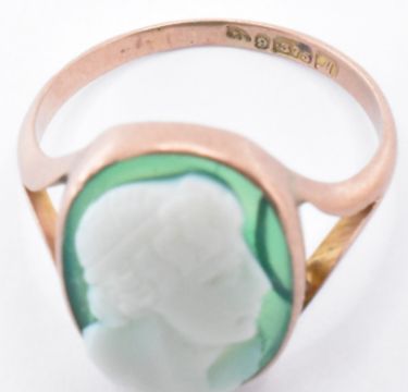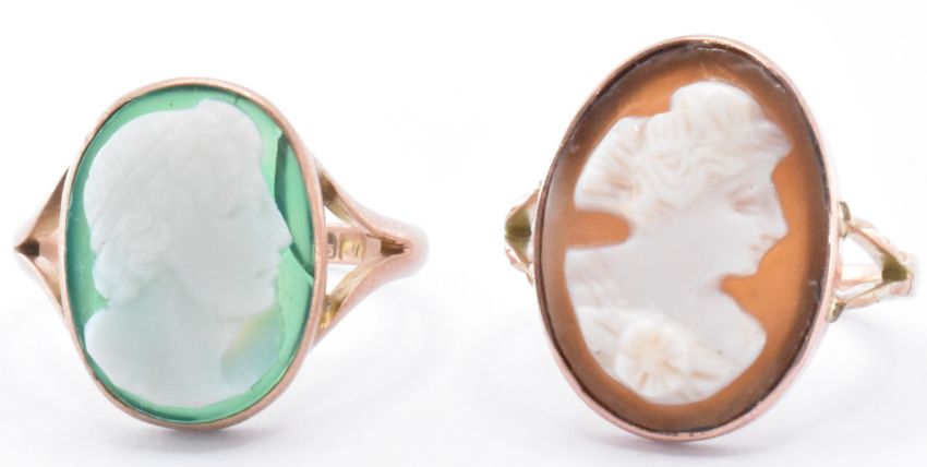 Two 9ct gold cameo rings. One being set with a green agate cameo portrait with pierced shoulders, the other having a conch shell cameo and pierced shoulders. Green stone hallmarked Chester 1912, size L.5. Conch cameo unmarked, tests indicate 9ct gold, R.5. Weight 6.6g.