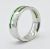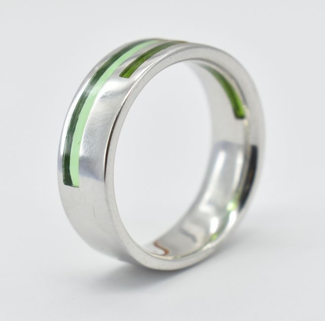 A French contemporary white metal band ring. The ring of plain band form having green glass windows. The ring cased in a box for Fontenay Bijoux Paris. Makers lozenge to outside of band. Test indicate platinum in parts. Weight 5.7.  Size O.5
