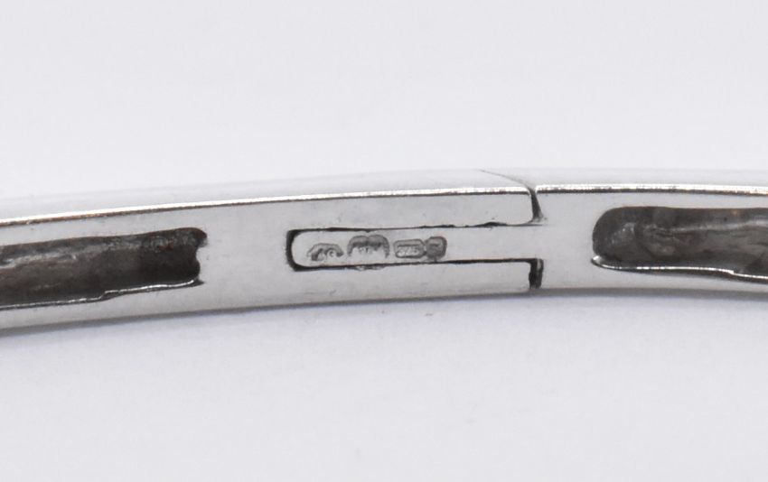 A hallmarked 9ct white gold bangle bracelet of wrap around design. The bracelet being set with three princess cut diamonds. Diamonds estimated at 0.25ct, measures approx. 2.5H x 1.3Dmm. Marked 9k with common control mark and London assay mark. Weight 8.3g. Interior circumference 16cm. Estimated clarity SI / VS, estimated colour H+. Good condition.
