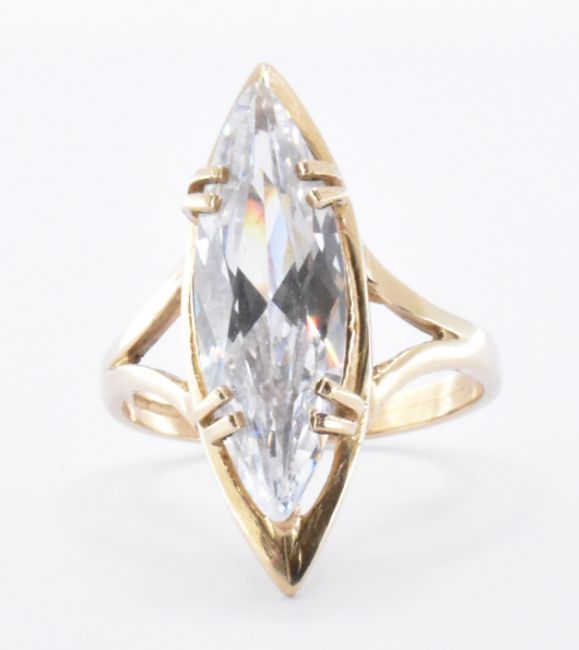 A hallmarked 9ct gold and white stone dress ring. The ring having a marquise cut white stone to the head within a claw setting and split shoulders. Marked 375. Assay marks for Birmingham. Weight 4.8g.