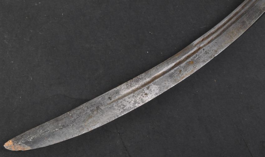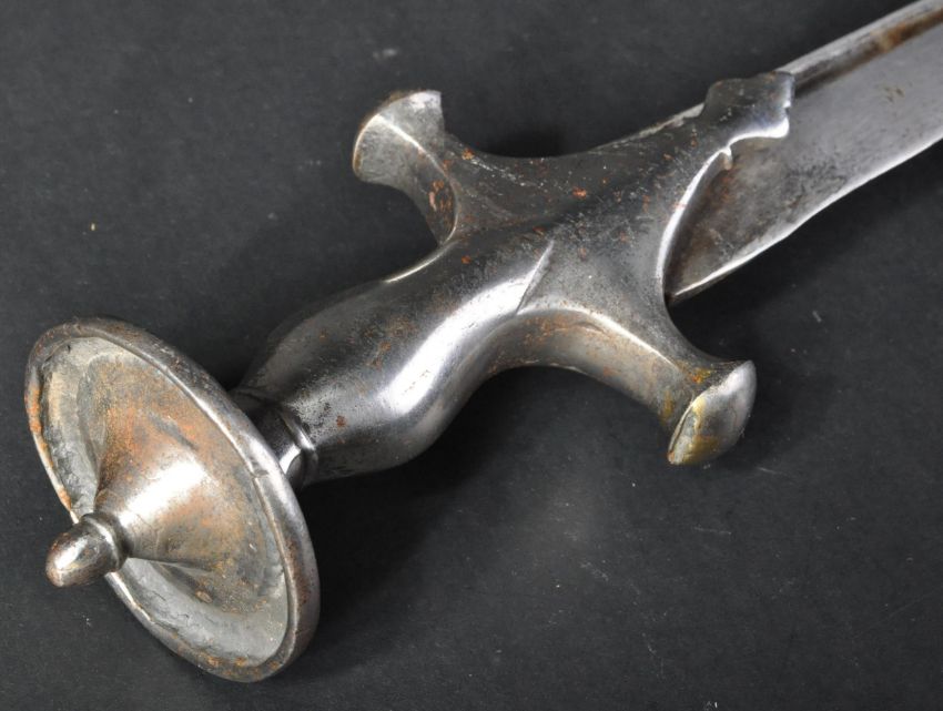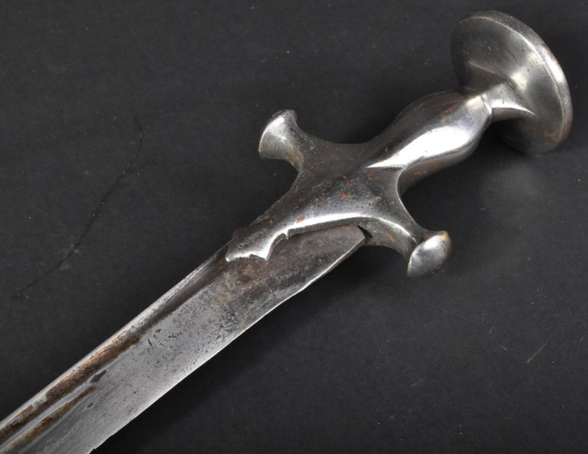 A 19th Century Indian Kirach / Tulwar ( Talwaar / Talwar ) sword. The sword having polished metal disc shaped pommel, swell to the grip and a cruciform cross guard with globular quillons leading to the curved single edge blade. Measures approx 90cm.