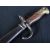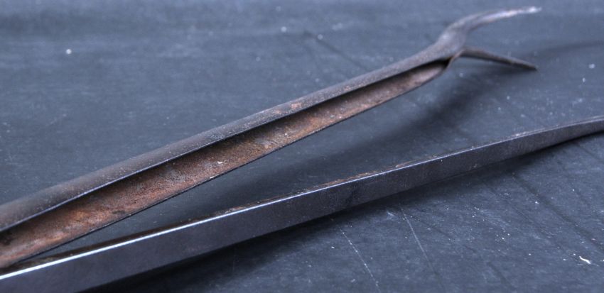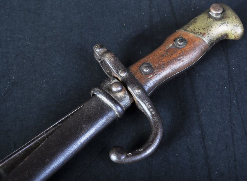 An unusual 19th Century 1874 pattern French Gras Rifle bayonet. Brass hooked pommel with push release button and wooden grip. Muzzle ring and forward facing quillon, marked to the crossguard 90298. The blade having the usual flat spine but curved to the end. The scabbard also split in two at the tip to form a claw. Measures approx 63cm.