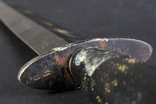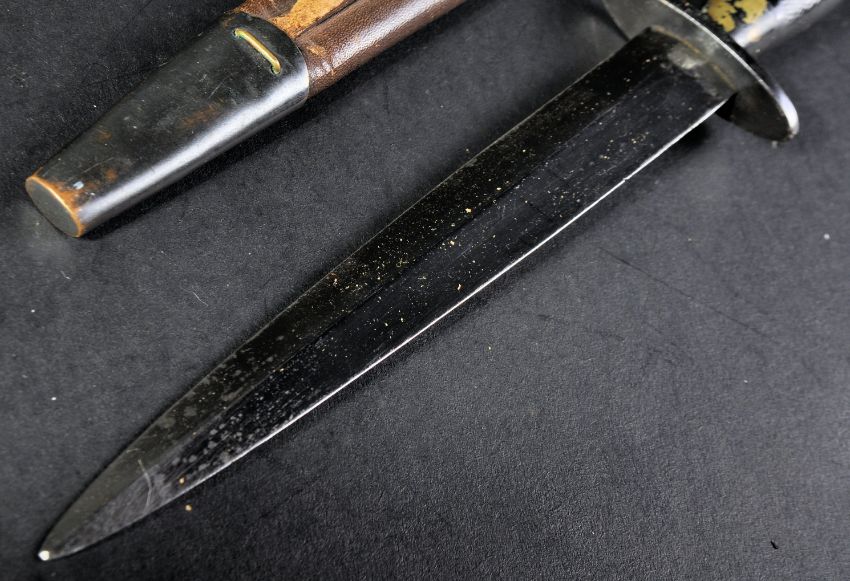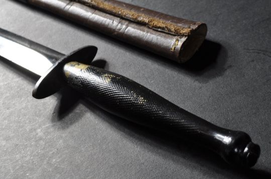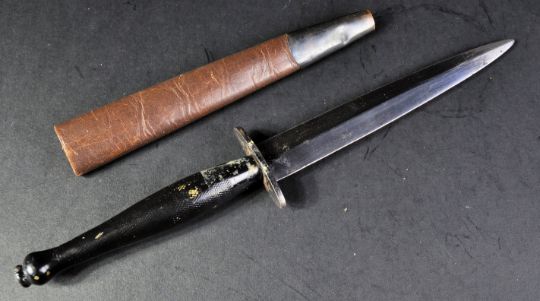A WWII Second World War era FS Fairbairn Sykes British commando knife dagger. The knife having a ribbed handle painted black and a cross guard partially stamped ' ⩚B2 ' (second pattern). The black steel blade housed in a brown leather scabbard. Measures approx 31cm.