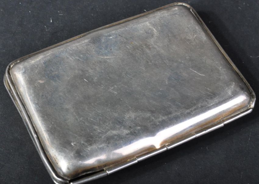 Of WWI First World War Interest - a 1919 hallmarked silver presentation cigarette case, engraved to the front ' Sergt A. Reading From The Sergt's Mess, 1st / 6th East Surrey Regiment, H. T. China - 1919 '. Hallmarks to interior for Birmingham, 1919. Some denting. Weight;