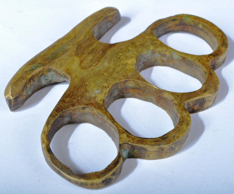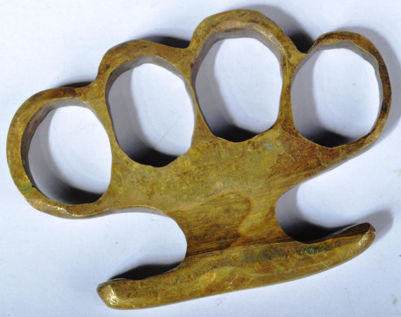 An original WWI First World War 1915 dated British Army Special Operations type knuckleduster / knuckle duster. Brass construction with large finger holes and smooth outer rim. Broad arrow markings and dated ' 15 ' (1915), with ' K. Hunn ' also impressed. Measures approx; 9.5cm long.