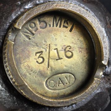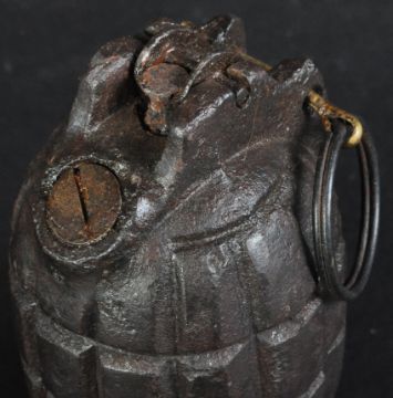 An original WWI First World War British Army inert No. 5 MKI mills bomb / hand grenade. Typical form, being a complete example with pin and firing lever present. The screw in base plug marked No. 5 MKI with 1916 date. Maker mark C.A.V for C.A Vandervell & Co.