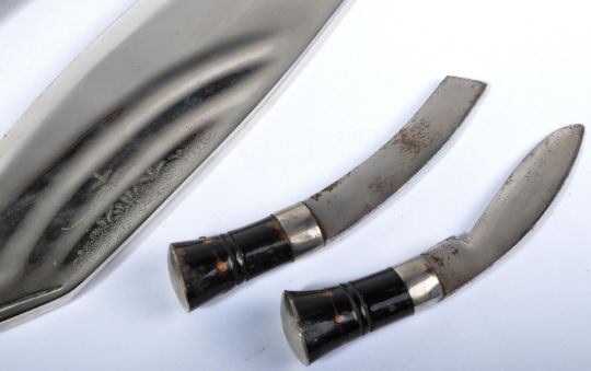 A vintage 20th Century Nepalese Gurkha Regiment kukri knife / dagger. Horn grip inlaid with white metal decoration and lions head to the pommel. The single edged blade with pokerwork detailing housed in a black leather scabbard. Both smaller Karda and Chakmak knives present. Measures approx 43cm long in total.