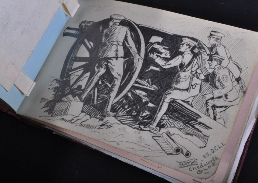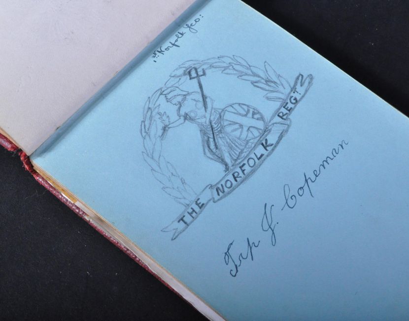 A WWI First World War interest autograph book belonging to one Ella C. Cadman, nurse, possibly Newcastle based, but also worked in the Bagthorpe Military Hospital. The autograph book filled with sketches, lots of intricate sketches of cap badges, poems etc. Cadman appears to have drawn a cap badge when she comes across someone from that regiment, then has each injured soldier sign their names under their relevant badge. Some laid-in photographs of soldiers and the hospital. Unique record, with some poignant poems noted.