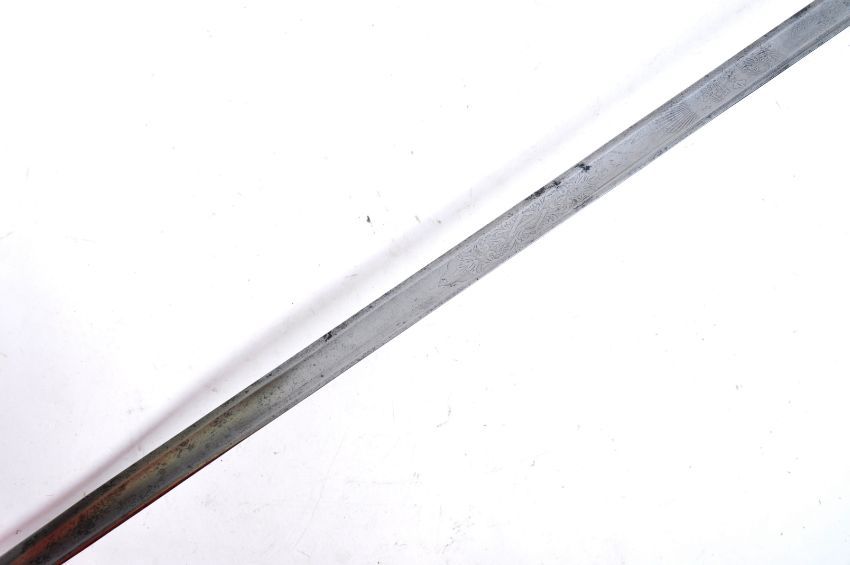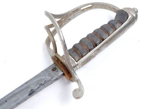 A 19th Century Victorian 1821 / George V pattern British Light Cavalry officers presentation sword. The sword having dome shaped pommel with ball finial and half-basket guard surrounding the wire wrapped texture grip. The ricasso marked with 6 pointed ' proved ' star and text reading ' Presented To Company Commander J. A Newsom , M.A By The Epsom & Ewell Platoons ' D ' Company 9th Battalion, Surrey V.T.C September 1915 '. The blade etched with scrollwork and King crown housed in a brown leather scabbard. Measures approx 108cm.