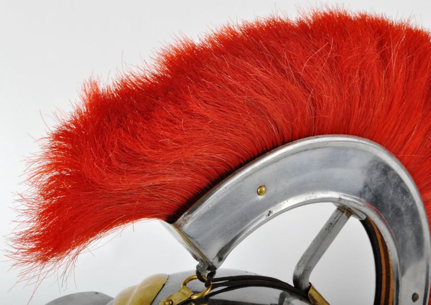 A 20th Century Roman Centurion / Gladiator reenactment Galea helmet. The helmet of steel and brass construction with hinged cheek pieces, brass decoration and a red plumed helm. With chin strap and liner present.