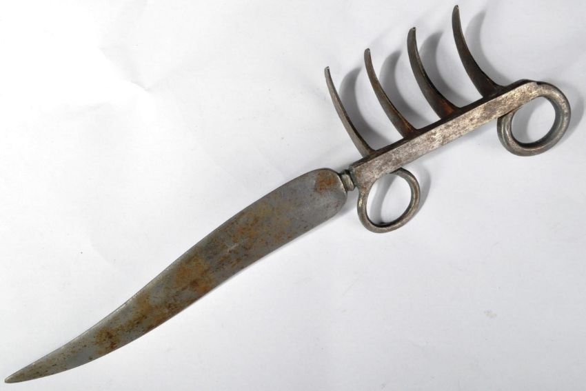 A late 18th / early 20th Century Indian / Middle Eastern Bagh Nakh fighting dagger. Steel construction, with two finger holes to the hilt, and a rake of four ' claws ', leading to a doubled edged curved blade. No visible maker's marks. Scarce antique weapon. Measures approx; 26cm long.